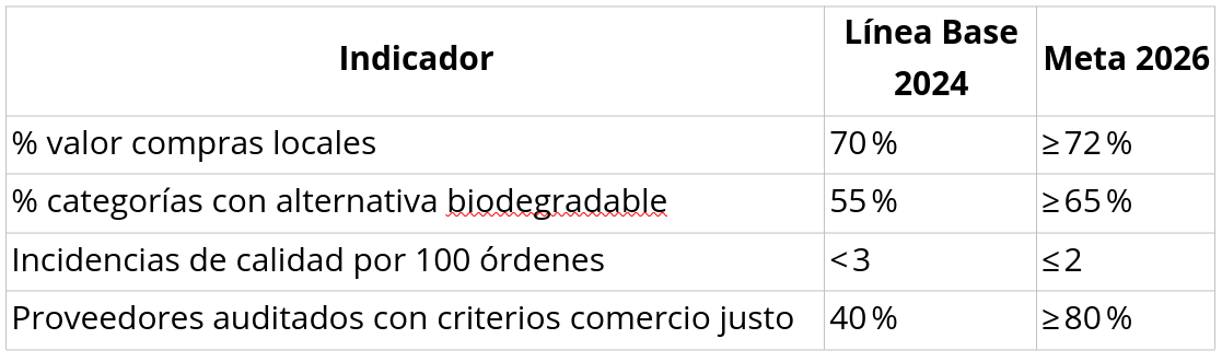 • Favorecemos proveedores que reduzcan emisiones (logística de baja huella y empaques eco‑diseñados).